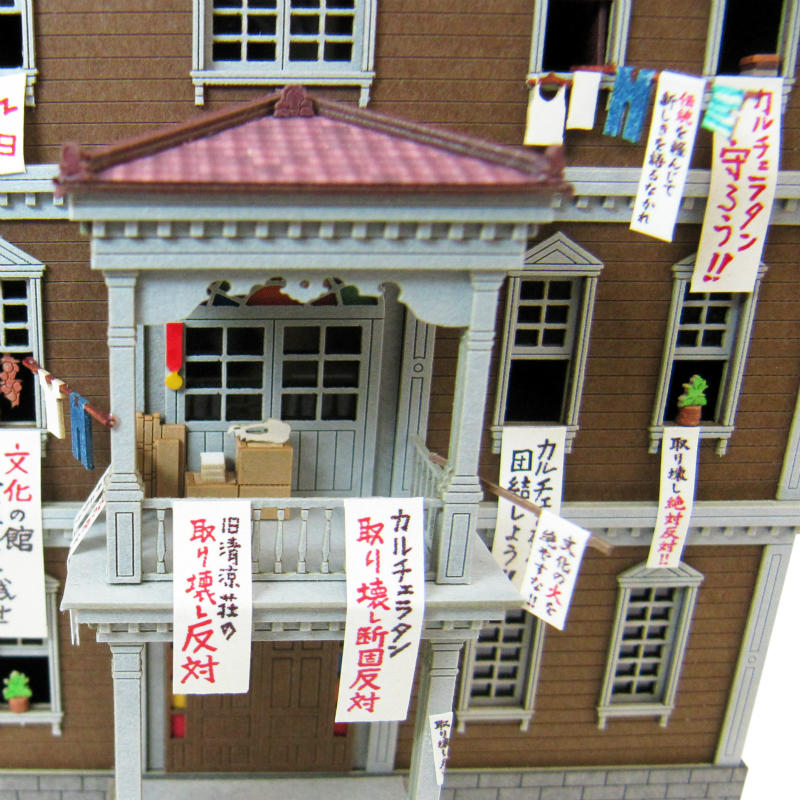 Attach small items to the second-floor balcony. Add cutouts of futons, laundry, and banners to the front windows.