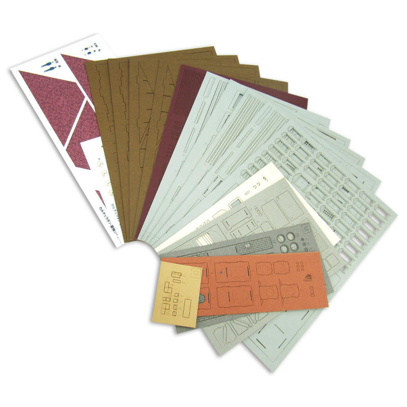 Laser-cut sheets A–O (15 sheets), roof sheet (1 sheet), printed sheet (1 sheet), plastic sheets (2 sheets), and instruction manual.