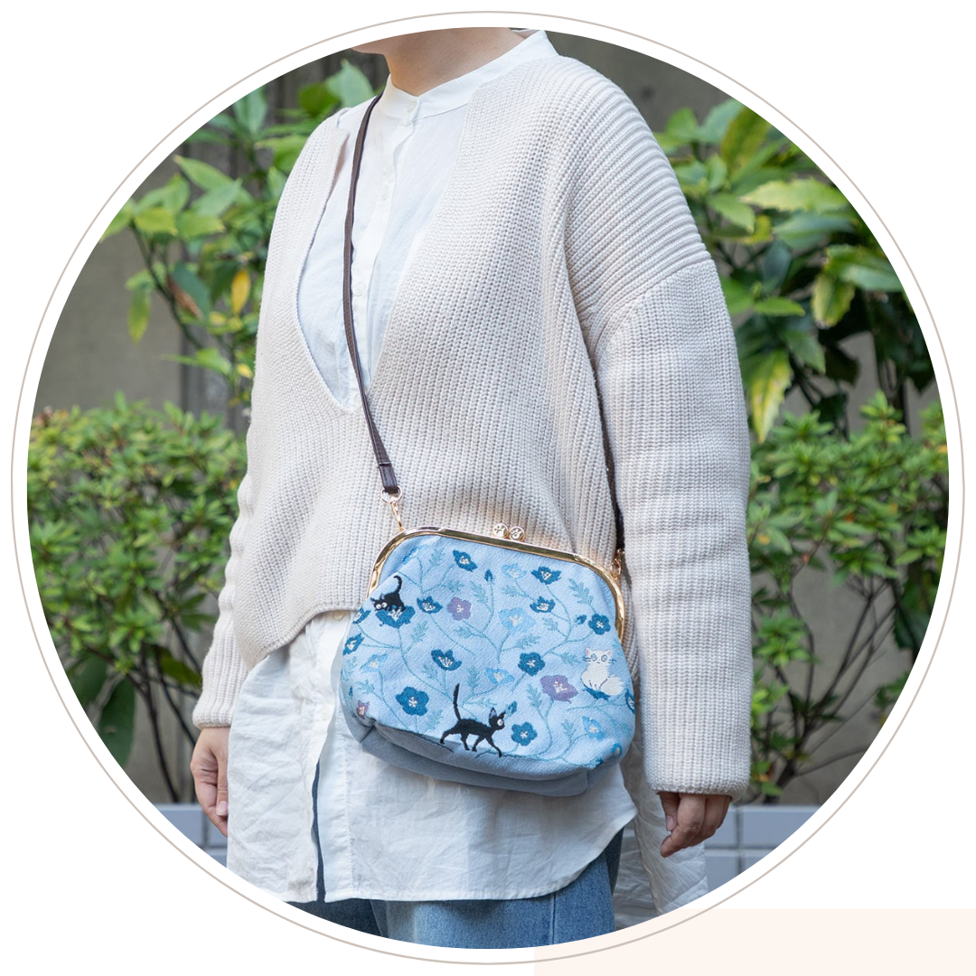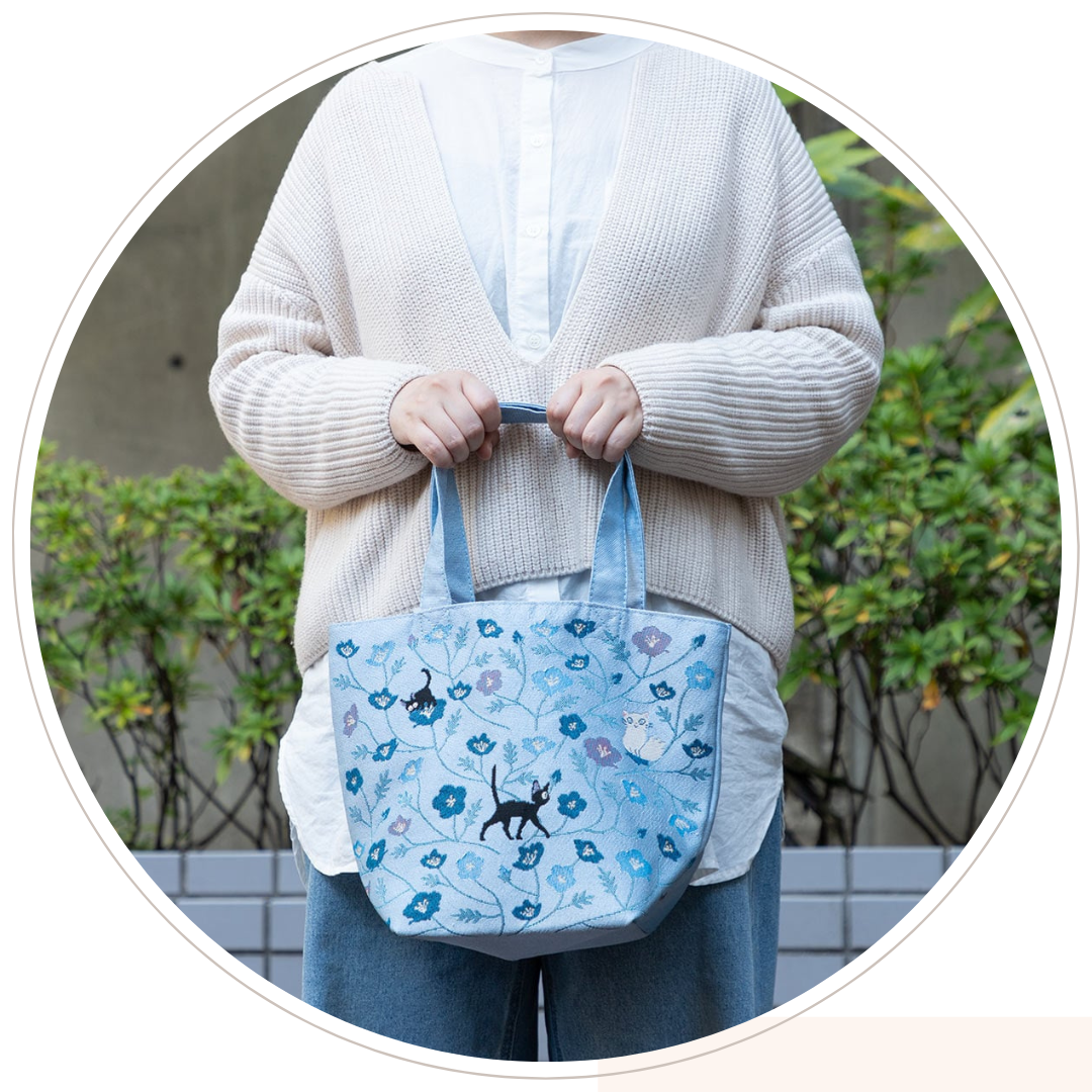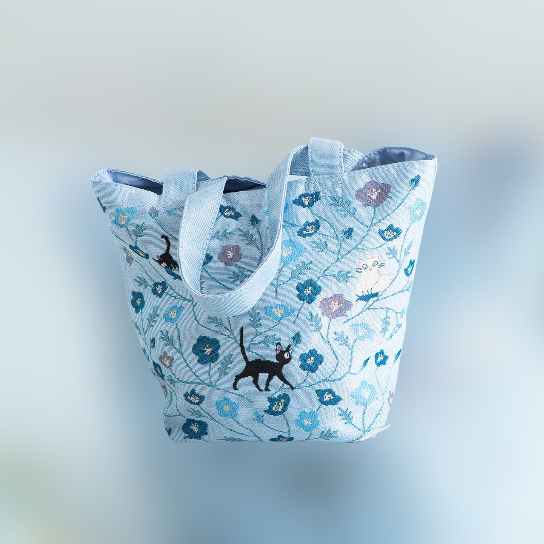 This luxurious gobelin woven bag features a stylish design with blue flowers and Jiji from the blue carpet series.